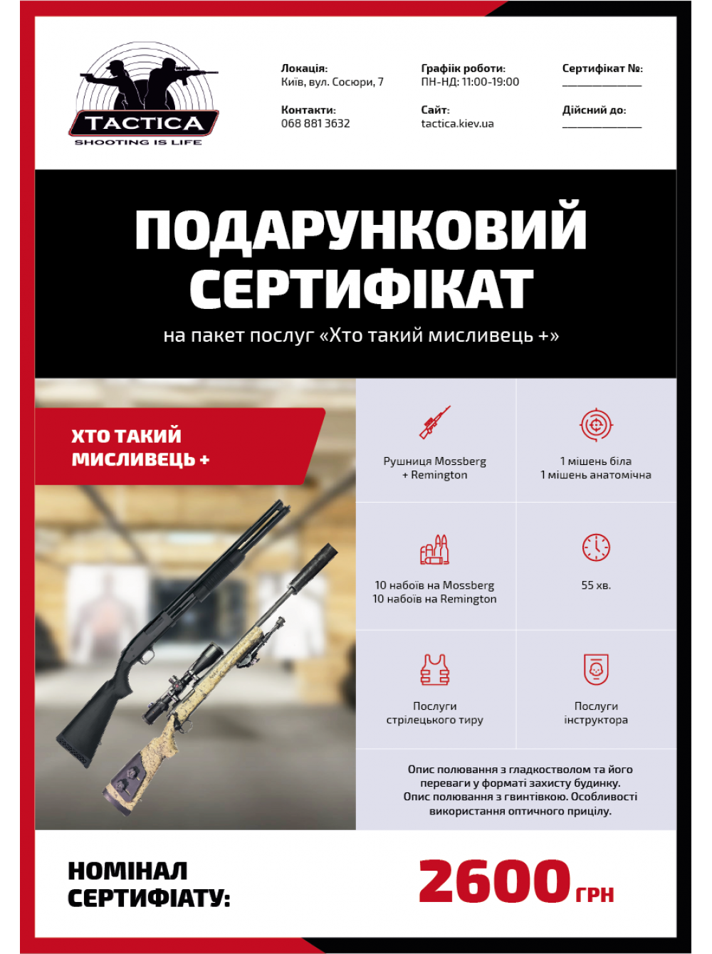 Подарунковий сертифікат «Хто такий мисливець +» - тренування зі стрільби з рушниць Mossberg + Remington