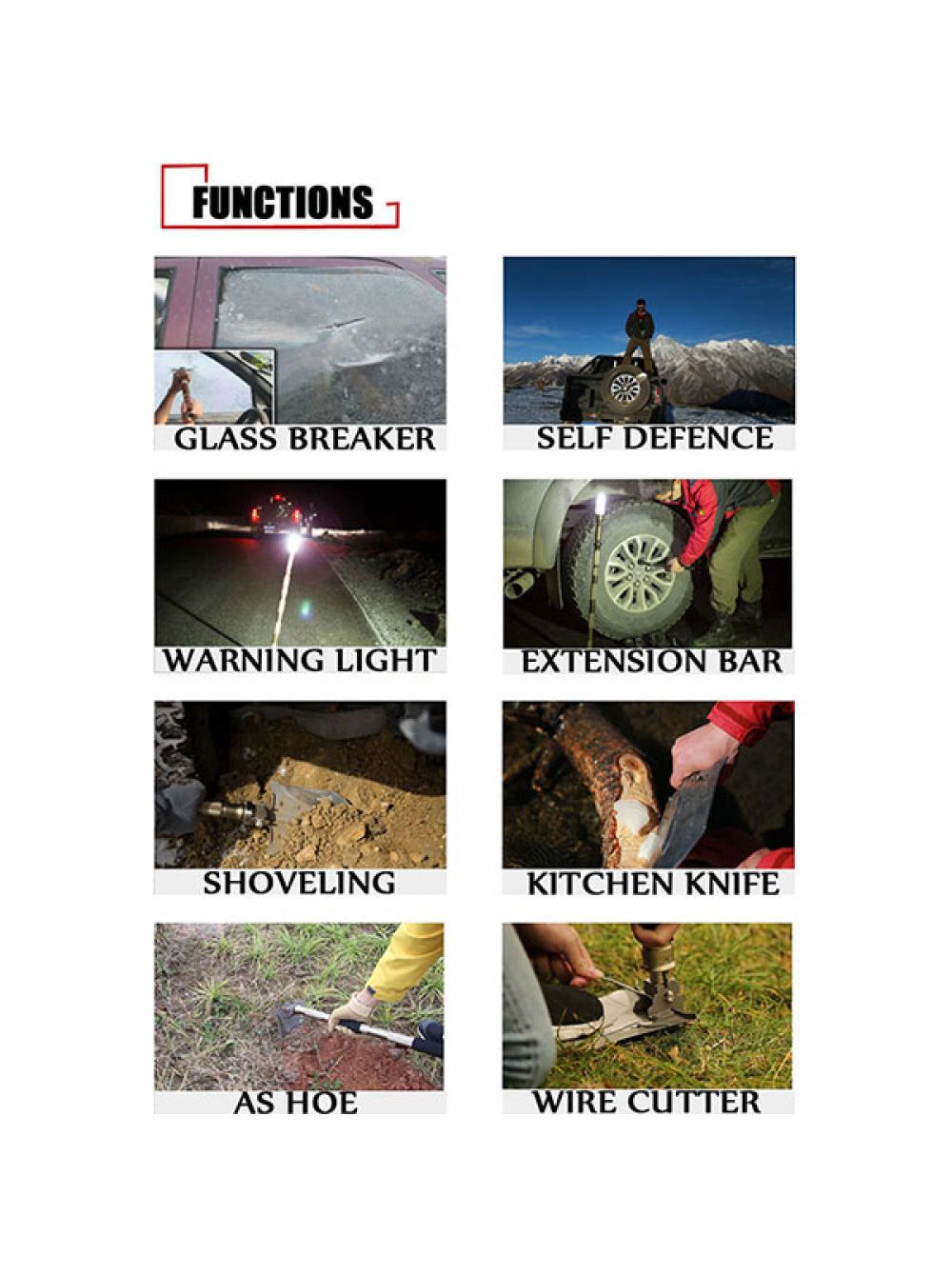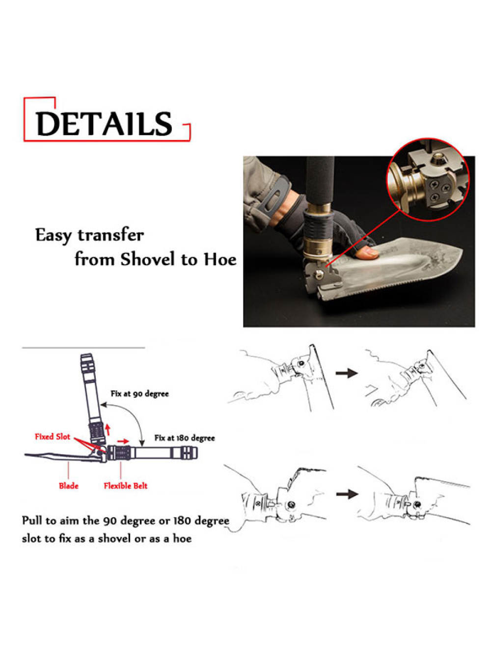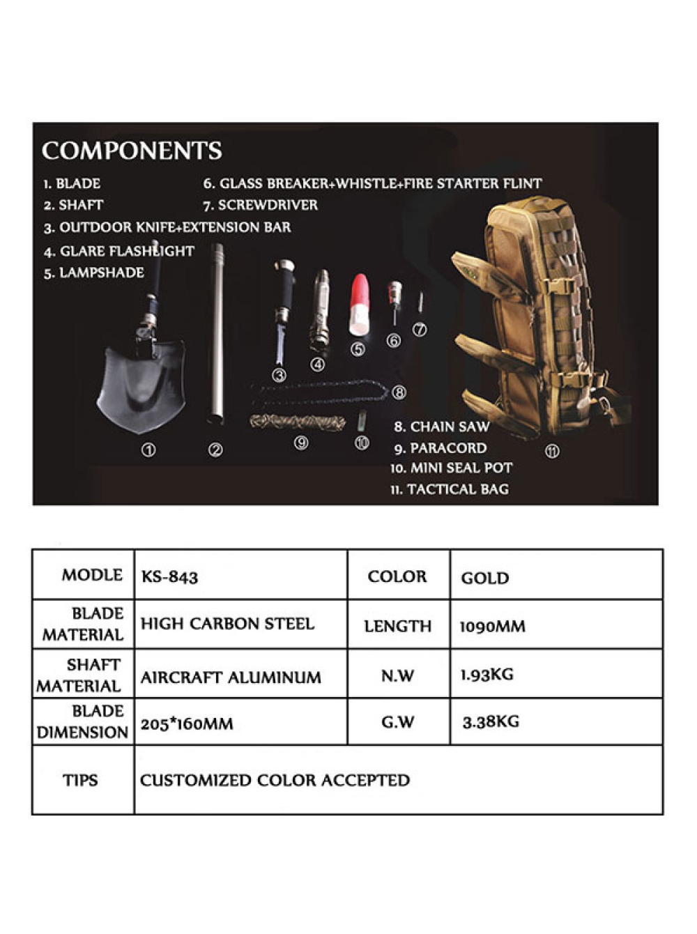 В комплект тактичної лопати Kyson KS-843 входить велика кількість пристосувань, які крім господарсько-побутового використання також розраховані на застосування в екстремальних, жорстких умовах дикої природи. Цілком можливо, що ви відкриєте для себе нове практичне застосування тих або інших інструментів, враховуючи їх різноманіття.