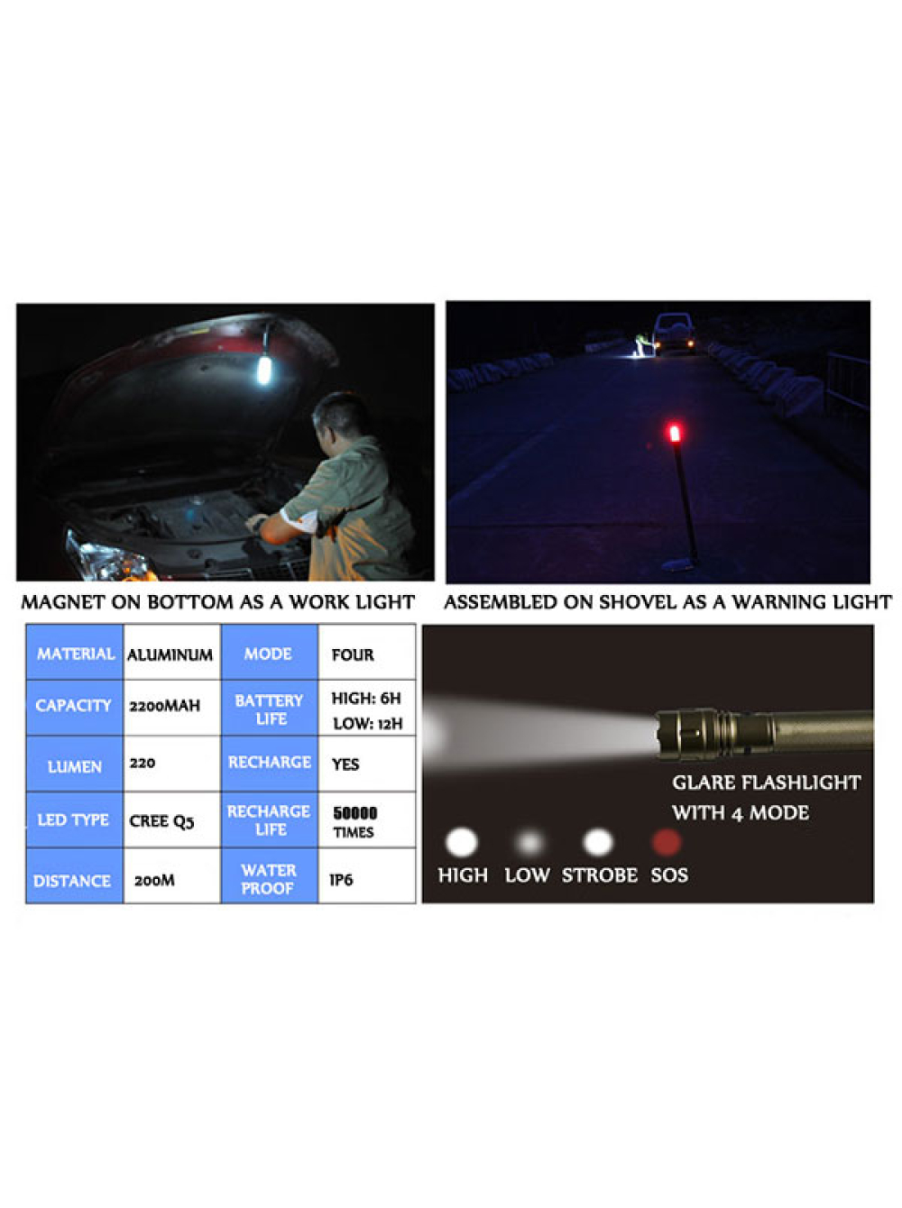 Всередині верхнього сегмента лопати є кресало, як окремий інструмент. Ще один сегмент рукоятки лопати — це світлодіодний ліхтарик з можливістю регулювання фокусної відстані променя. У базовому комплекті поставляються батареї, необхідні для його роботи, а також пластикові розсіювальні фільтри, які можна використовувати в якості сигнальних паличок. У торці ліхтарика вбудований магніт, який дозволяє легко фіксувати ліхтарик на будь-якому залізному об'єкті. Також в комплект входять: знімний ніж, знімна крижана сокирка, склобій і біт з двома варіантами викруток.
